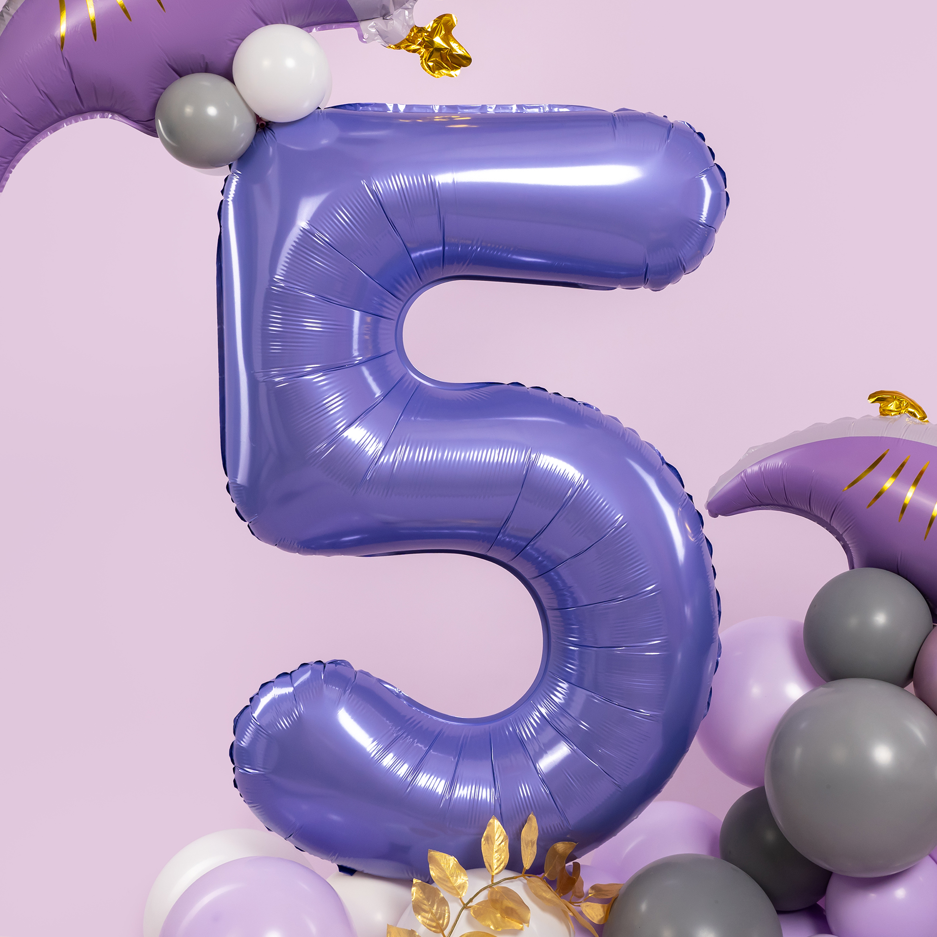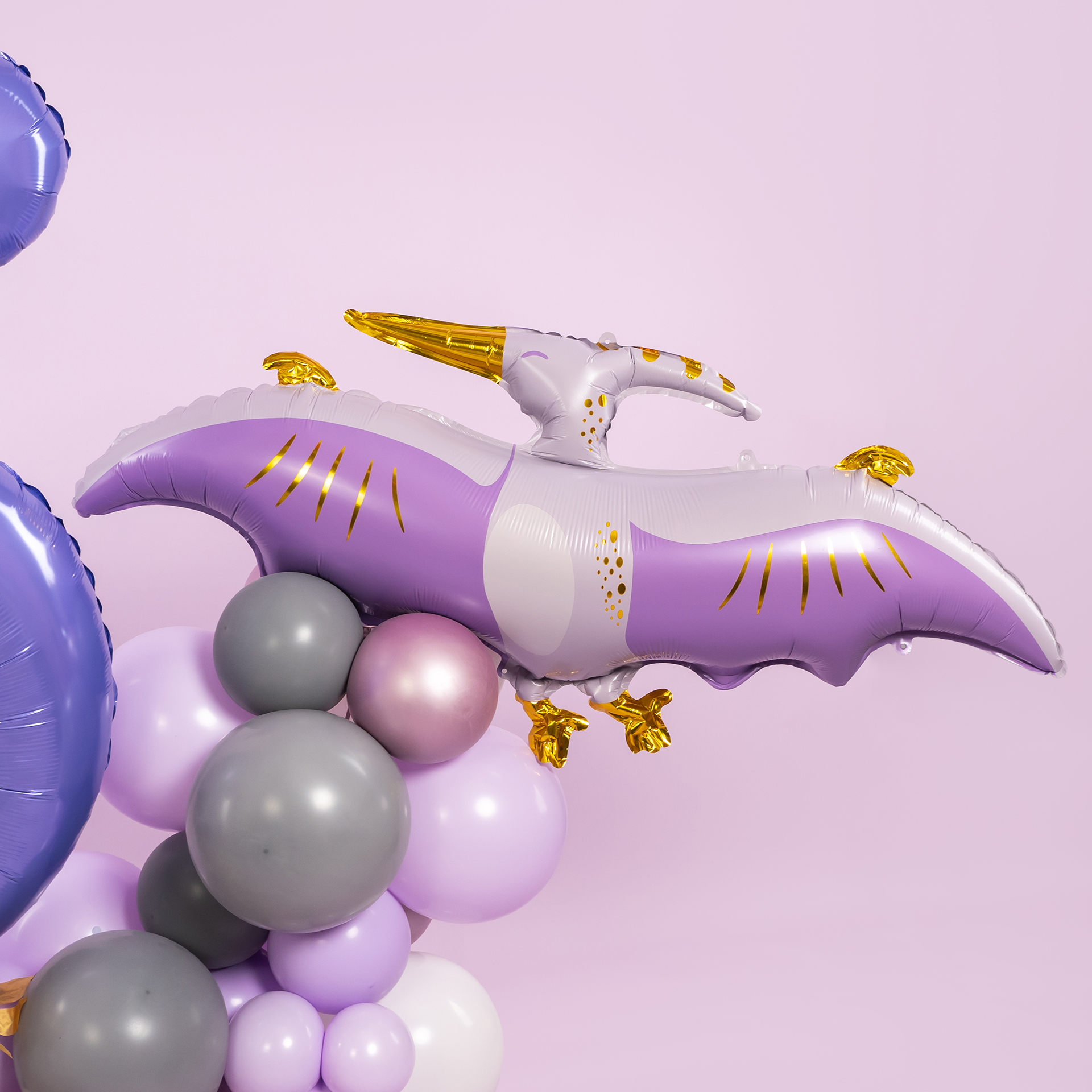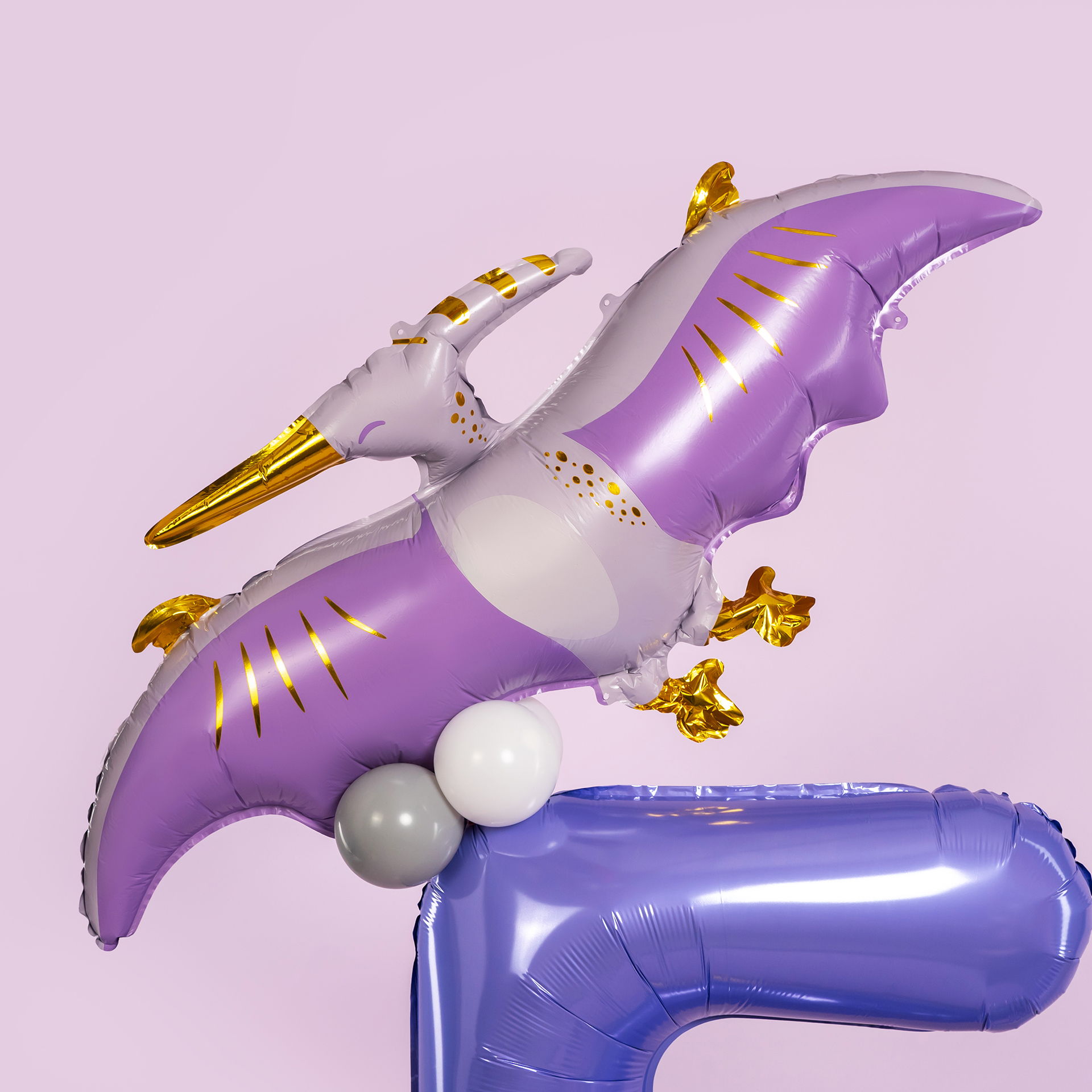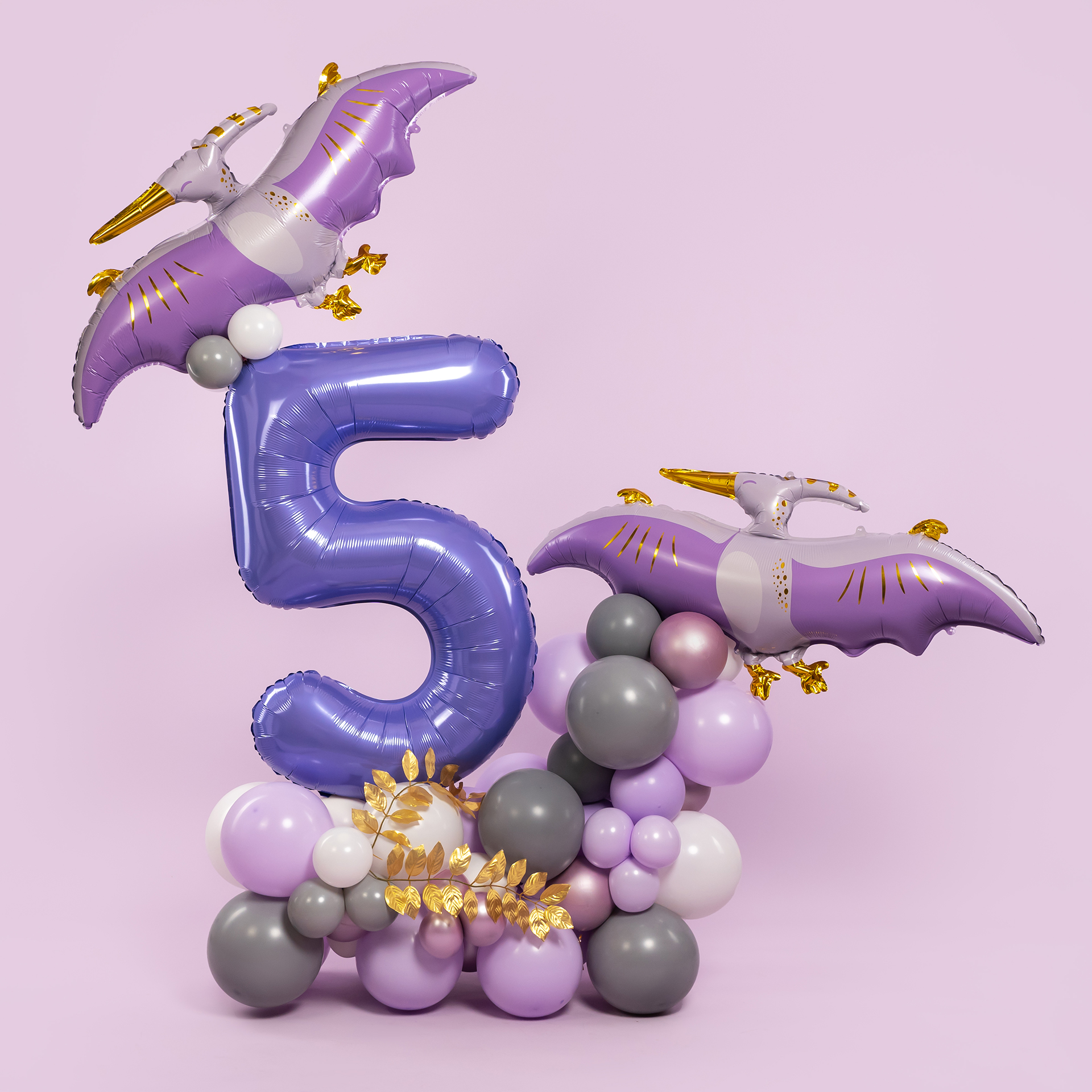 Яркая фотозона с цифрой и птеродактелями создаёт атмосферу доисторического приключения и детской фантазии. Стильная сиренево-фиолетовая палитра, золотые акценты и динамичный воздушный декор делают фотосессию эффектной и эмоциональной.